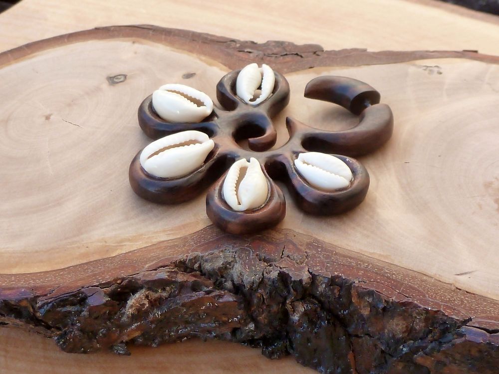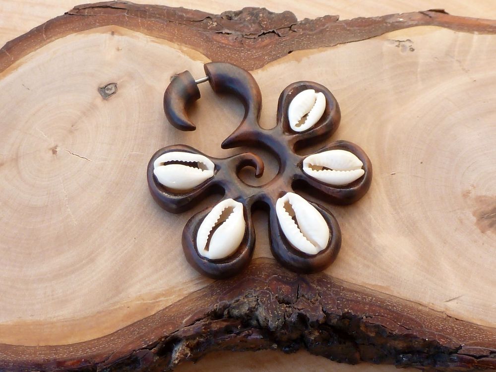 Fake Ohrstecker aus Holz mit echter Kauri Schnecke