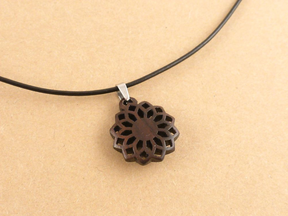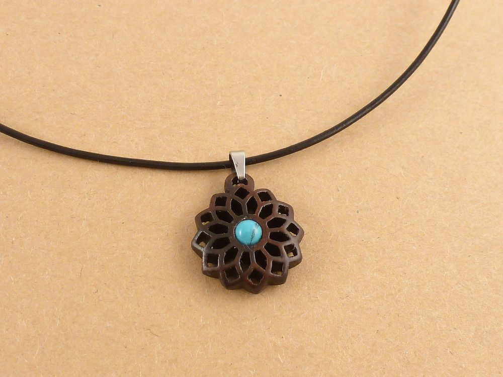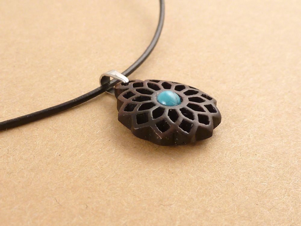 mit einer Blüte aus Holz und türkisfarbenem Stein