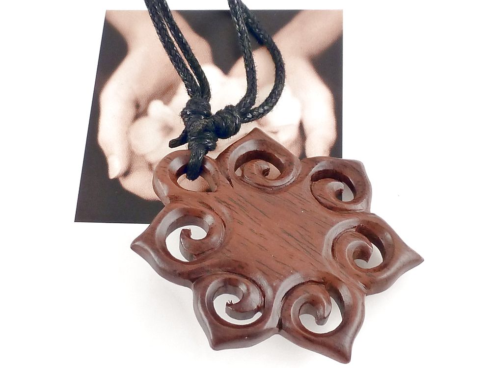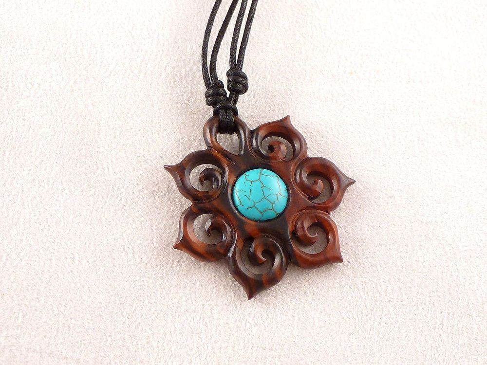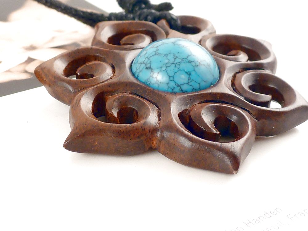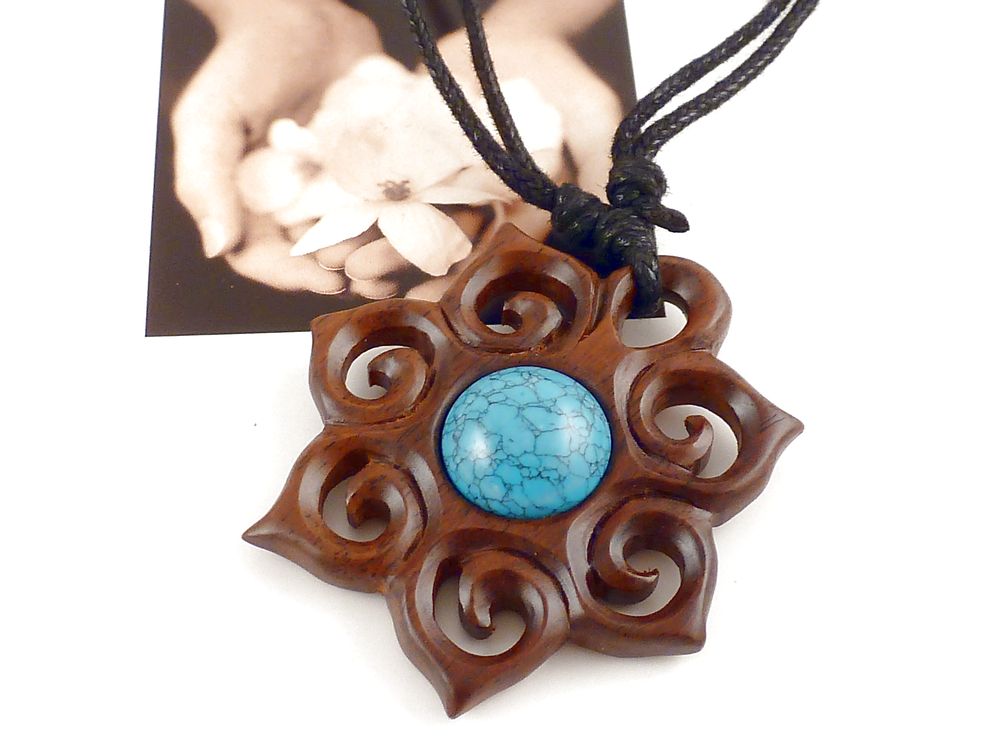 mit einem Anhänger aus Holz in Form einer Blume mit